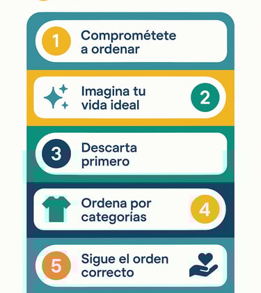 A diferencia del enfoque tradicional, KonMari no comienza por estancias (cocina, salón, baño), sino por categorías de objetos: ropa, libros, papeles, komono (misceláneos) y objetos sentimentales.