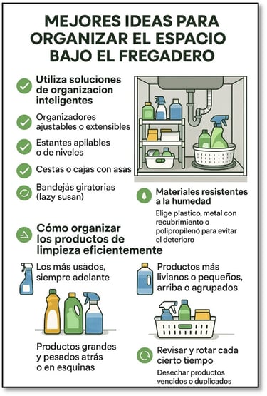 Zona de alta rotación: Los productos que usas diariamente (detergente, bayeta, limpiacristales) deben estar en la parte más accesible, idealmente en la zona frontal o en un organizador giratorio.